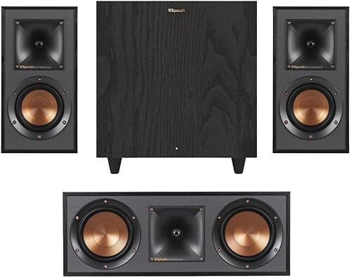 Looking for compact speakers for the front three? This bundle includes a pair of 2-way Klipsch Reference R-41M bookshelf speakers, the matching R-52C center channel speaker, and an R-80SWi wireless 8″ down-firing ported powered (50 watts RMS and 150 watts peak) subwoofer. No subwoofer cable is required! [buy at Amazon]