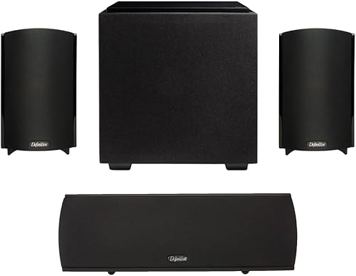 This bundle includes two compact Definitive Technology ProMonitor 800 bookshelf speakers, a matching ProCenter 1000 center channel speaker, and a Descend DN8 subwoofer with an 8″ front-firing long-throw woofer and two 8″ passive bass radiators powered by a 200 watt RMS and 500 watt peak Class D amplifier [buy at Amazon]; Or upgrade to the ProMonitor 1000 bookshelf speakers for front left and right with same ProCenter 1000 center and Descend DN8 sub [buy at Amazon]