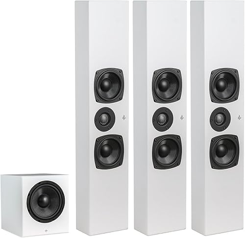 Looking for higher-end speakers that can be mounted on the wall? This bundle includes three Totem KIN Solo architectural wall speakers and a KIN SUB 8 powered subwoofer which of course features an 8″ front-firing woofer with rear slotted port powered by a 200-watt RMS class D amplifier. [Buy at Amazon in Satin White or Satin Black]